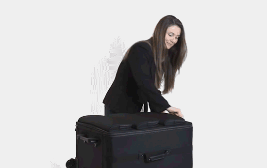現(xiàn)在就有這么一個神奇的旅行箱,外觀和普通箱子沒差,打開拉鏈之后,如上圖所示:將箱體兩側的伸縮拉桿打開,再拎起中間的軟包疊放架,掛好,一個擺放整齊、井然有序的隨身衣柜瞬間出現(xiàn)。行李箱蓋板上的三個拉鏈口袋,瞬間也成了臨時置物袋。